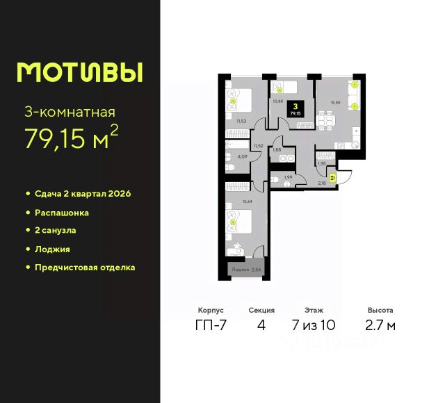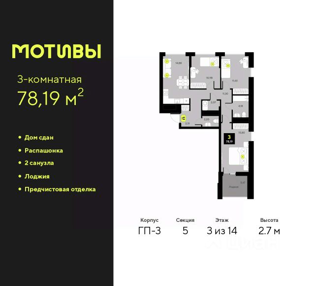 3-комн. квартира с предчистовой отделкой в ЖК "Мотивы" на 5 этаже. Общая площадь: 78.79 кв.м., жилая: 38.42 кв.м., площадь просторной кухни-столовой: 15.71 кв.м. Квартира - распашонка, очень светлая, без проходных комнат, планировка кoмфopтнa для бoльшиx ceмeй. В квартире одна лоджия, один совмещенный и один раздельный санузел. Высота потолков 2.7 м. Квартира будет сдаваться с предчистовой отделкой White Box: выровнены и оштукатурены стены, проведено электричество и отопление, установлены радиаторы. Вы также можете приобрести квартиру с ремонтом от застройщика, представленным в трех цветовых решениях Scandi, Wood и Coffee и включающим ламинат, обои под покраску, двери, натяжной потолок и санузел с сантехникой. При желании вы можете заказать отделку под ключ, варианты возможных решений представлены в альбоме фотографий. Квартира находится в корпусе ГП-2. Дом монолитный, одноподъездный, высотой 7 этажей. На этаже 5 квартир. В подъезде 1 пассажирский и 1 грузовой лифт. На сегодняшний день строительство завершено, дом сдан в 4 квартале 2024 года. Оформление сделки по договору купли-продажи. Закрытая от автомобилей территория, безопасный двор и камеры видеонаблюдения - гаранты вашего спокойствия. Квартал будет располагать богатой инфраструктурой: на первых этажах разместятся магазины, пекарни, кофейни, пункты выдачи, аптеки, детские центры, цветочные салоны и многое другое, что сделает жизнь поистине комфортной. Рядом находится парк общей площадью почти 5000 м², в котором располагаются локации для игр и отдыха жителей, здесь можно совершить утреннюю пробежку или прогуляться после рабочего дня. В парке есть зона воркаута с тренажерами для взрослых, игровые комплексы с горками и канатный комплекс для детей разных возрастов, качели и лавочки для отдыха, площадки для командных видов спорта и для панна-футбола. В ЖК "Мотивы" всё продумано до мелочей: светлые холлы входных групп, оформленные в едином стиле, просторные колясочные, лапомойки для питомцев. На территории комплекса находятся 2 8-ми этажных паркинга и более 1000 м/м на открытой парковке. Жилой комплекс находится в одном из экологически благоприятных районов Тюмени, недалеко от Плехановского бора. При этом до центра города можно добраться за 15 минут, а до международного аэропорта Рощино за 13 минут. Окончание строительства: ГП 1, 2, 3, 4 сдача до конца 2024 года, ГП 6, 7, 8 сдача 2 квартал 2026 года. #ZSodaI