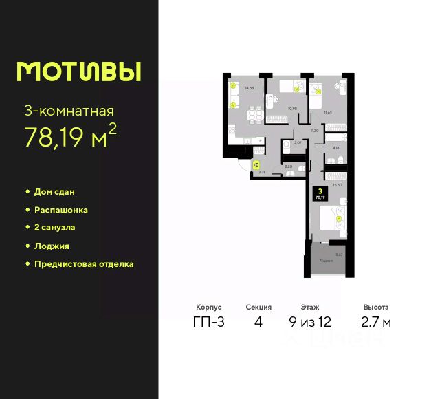 Трехкомнатная квартира от застройщика с предчистовой отделкой в ЖК "Мотивы" на 5 этаже. Общая площадь: 78.79 кв.м., жилая: 38.42 кв.м., площадь просторной кухни-столовой: 15.71 кв.м. Квартира - распашонка, без проходных комнат, окна выходят на paзные стороны дома. В квартире одна лоджия, один совмещенный и один раздельный санузел. Высота потолков 2.7 м. Квартира будет сдаваться с предчистовой отделкой White Box: выровнены и оштукатурены стены, проведено электричество и отопление, установлены радиаторы. Вы также можете приобрести квартиру с ремонтом от застройщика, представленным в трех цветовых решениях Scandi, Wood и Coffee и включающим ламинат, обои под покраску, двери, натяжной потолок и санузел с сантехникой. При желании вы можете заказать отделку под ключ, варианты возможных решений представлены в альбоме фотографий. Квартира находится в корпусе ГП-2. Дом монолитный, одноподъездный, высотой 7 этажей. На этаже 5 квартир. В подъезде 1 пассажирский и 1 грузовой лифт. Строительство окончено, дом сдан в 4 квартале 2024 года. Оформление сделки по договору купли-продажи. Закрытая от автомобилей территория, безопасный двор и камеры видеонаблюдения - гаранты вашего спокойствия. Квартал будет располагать богатой инфраструктурой: на первых этажах разместятся магазины, пекарни, кофейни, пункты выдачи, аптеки, детские центры, цветочные салоны и многое другое, что сделает жизнь поистине комфортной. Рядом находится парк общей площадью почти 5000 м², в котором располагаются локации для игр и отдыха жителей, здесь можно совершить утреннюю пробежку или прогуляться после рабочего дня. В парке есть зона воркаута с тренажерами для взрослых, игровые комплексы с горками и канатный комплекс для детей разных возрастов, качели и лавочки для отдыха, площадки для командных видов спорта и для панна-футбола. В ЖК "Мотивы" всё продумано до мелочей: светлые холлы входных групп, оформленные в едином стиле, просторные колясочные, лапомойки для питомцев. На территории комплекса находятся 2 8-ми этажных паркинга и более 1000 м/м на открытой парковке. Жилой комплекс находится в одном из экологически благоприятных районов Тюмени, недалеко от Плехановского бора. При этом до центра города можно добраться за 15 минут, а до международного аэропорта Рощино за 13 минут. Окончание строительства: ГП 1, 2, 3, 4 сдача до конца 2024 года, ГП 6, 7, 8 сдача 2 квартал 2026 года. #2SOdAi