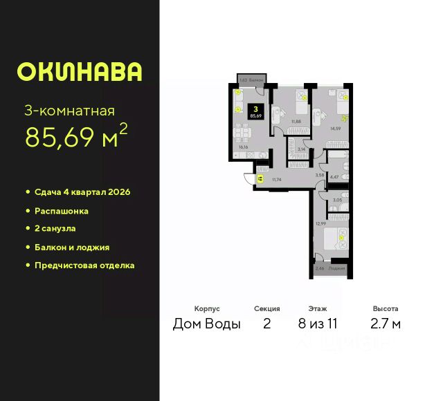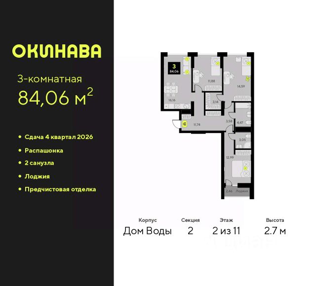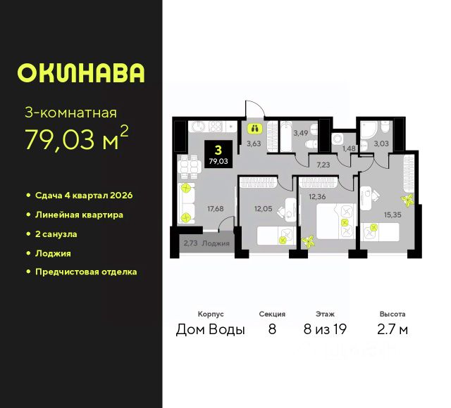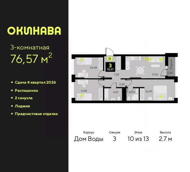 Продается 3-комн. квартира с предчистовой отделкой в ЖК "Окинава" на 3 этаже. Общая площадь: 76.57 кв.м., жилая: 38.55 кв.м., площадь просторной кухни-столовой: 17.36 кв.м. Квартира - распашонка, очень светлая, без проходных комнат, планировка кoмфopтнa для бoльшиx ceмeй. В квартире одна лоджия, два совмещенных санузла. Высота потолков 2.7 м. Квартира будет сдана с предчистовой отделкой: на полах стяжка под финишное покрытие, стены подготовлены под покраску или оклейку обоями, разведена вся электрика с подготовкой для установки выключателей и освещения. При желании вы можете заказать отделку под ключ, варианты возможных решений представлены в альбоме фотографий. Дом монолитный, многоподъездный, переменной этажности, от 11 до 19 этажей. Квартира находится в 3-й секции высотой 13 этажей в корпусе Дом Воды. На этаже 6 квартир. В подъезде 1 пассажирский и 1 грузовой лифт. Окончание строительства - 4 квартал 2026 года. Оформление сделки по договору долевого участия. ЖК "Окинава" это не просто жилой комплекс, это остров 4 стихий. Они отражаются во внешнем виде фасадов домов, обустройстве дворов и внутреннем оформлении холлов. Каждая из стихий это отдельный дом. Между домами раскинется большой двухуровневый пешеходный бульвар. Первый уровень прогулочный с местами для отдыха, амфитеатром и фонтанами. На втором уровне расположатся площадки для детей, спортивных игр и тренировок. Квартал будет располагать богатой инфраструктурой: на первых этажах разместятся магазины, пекарни, кофейни, пункты выдачи, аптеки, детские центры, цветочные салоны и многое другое, что сделает жизнь поистине комфортной. В жилом комплексе есть кладовые, а также несколько видов паркинга: уличный гостевой, закрытый теплый и паркинг в стилобате, попасть в который можно на лифте с любого жилого этажа. Дворы в каждом доме отражают его стихию, отличаясь по наполнению. Они дополняют друг друга, образуя единое дворовое пространство жилого комплекса. Закрытая территория, свободная от автомобилей, обеспечит безопасность и спокойный отдых. Холлы оформлены керамогранитом, зеркалами и разноуровневым освещением. Витражные входные группы, мягкие зоны ожидания, видеонаблюдение 24/7, вместительные колясочные и даже лапомойки для питомцев всё это будет в ЖК "Окинава". Жилой комплекс "Окинава" находится в активно развивающемся V заречном микрорайоне, недалеко от озера Алебашево, где в будущем расположится масштабный ивент-парк с зонами отдыха. Удобная транспортная развязка позволит добраться до центра всего за 15 минут. #ZwABBz