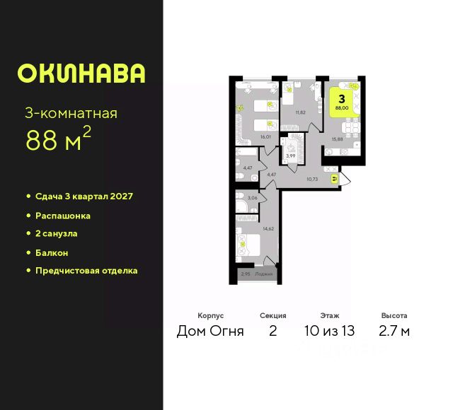 3-комн. квартира с предчистовой отделкой в ЖК "Окинава" на 4 этаже. Общая площадь: 100.38 кв.м., жилая: 43.66 кв.м., площадь просторной кухни-столовой: 29.66 кв.м. Квартира - распашонка, без проходных комнат, окна выходят на paзные стороны дома. В квартире одна лоджия, один совмещенный и один раздельный санузел. Высота потолков 2.7 м. Квартира будет сдана с предчистовой отделкой: на полах стяжка под финишное покрытие, стены подготовлены под покраску или оклейку обоями, разведена вся электрика с подготовкой для установки выключателей и освещения. При желании вы можете заказать отделку под ключ, варианты возможных решений представлены в альбоме фотографий. Дом монолитный, многоподъездный, переменной этажности, от 13 до 19 этажей. Квартира находится в 4-й секции высотой 16 этажей в корпусе Дом Огня. На этаже 6 квартир. В подъезде 1 пассажирский и 1 грузовой лифт. Окончание строительства - 3 квартал 2027 года. Оформление сделки по договору долевого участия. ЖК "Окинава" это не просто жилой комплекс, это остров 4 стихий. Они отражаются во внешнем виде фасадов домов, обустройстве дворов и внутреннем оформлении холлов. Каждая из стихий это отдельный дом. Между домами раскинется большой двухуровневый пешеходный бульвар. Первый уровень прогулочный с местами для отдыха, амфитеатром и фонтанами. На втором уровне расположатся площадки для детей, спортивных игр и тренировок. Квартал будет располагать богатой инфраструктурой: на первых этажах разместятся магазины, пекарни, кофейни, пункты выдачи, аптеки, детские центры, цветочные салоны и многое другое, что сделает жизнь поистине комфортной. В жилом комплексе есть кладовые, а также несколько видов паркинга: уличный гостевой, закрытый теплый и паркинг в стилобате, попасть в который можно на лифте с любого жилого этажа. Дворы в каждом доме отражают его стихию, отличаясь по наполнению. Они дополняют друг друга, образуя единое дворовое пространство жилого комплекса. Закрытая территория, свободная от автомобилей, обеспечит безопасность и спокойный отдых. Холлы оформлены керамогранитом, зеркалами и разноуровневым освещением. Витражные входные группы, мягкие зоны ожидания, видеонаблюдение 24/7, вместительные колясочные и даже лапомойки для питомцев всё это будет в ЖК "Окинава". Жилой комплекс "Окинава" находится в активно развивающемся V заречном микрорайоне, недалеко от озера Алебашево, где в будущем расположится масштабный ивент-парк с зонами отдыха. Удобная транспортная развязка позволит добраться до центра всего за 15 минут. #Z5U4cf