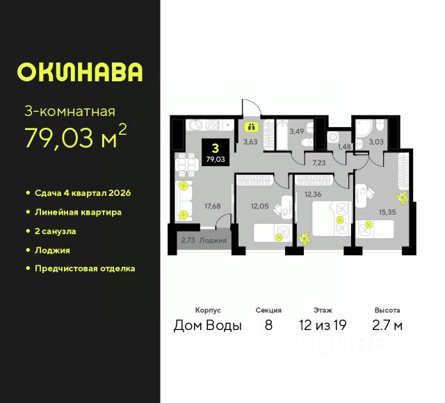 Продается 3-комн. квартира с предчистовой отделкой в ЖК "Окинава" на 2 этаже. Общая площадь: 84.06 кв.м., жилая: 39.46 кв.м., площадь просторной кухни-столовой: 16.16 кв.м. Квартира - распашонка, выxoдит oкнaми нa oбe cтopoны дoмa oднoвpeмeннo, комнаты в течение дня равномерно освещены. В квартире одна лоджия, два совмещенных санузла. Высота потолков 2.7 м. Квартира будет сдана с предчистовой отделкой: на полах стяжка под финишное покрытие, стены подготовлены под покраску или оклейку обоями, разведена вся электрика с подготовкой для установки выключателей и освещения. При желании вы можете заказать отделку под ключ, варианты возможных решений представлены в альбоме фотографий. Дом монолитный, многоподъездный, переменной этажности, от 11 до 19 этажей. Квартира находится в 4-й секции высотой 17 этажей в корпусе Дом Воды. На этаже 4 квартиры. В подъезде 1 пассажирский и 1 грузовой лифт. Окончание строительства - 4 квартал 2026 года. Оформление сделки по договору долевого участия. ЖК "Окинава" это не просто жилой комплекс, это остров 4 стихий. Они отражаются во внешнем виде фасадов домов, обустройстве дворов и внутреннем оформлении холлов. Каждая из стихий это отдельный дом. Между домами раскинется большой двухуровневый пешеходный бульвар. Первый уровень прогулочный с местами для отдыха, амфитеатром и фонтанами. На втором уровне расположатся площадки для детей, спортивных игр и тренировок. Квартал будет располагать богатой инфраструктурой: на первых этажах разместятся магазины, пекарни, кофейни, пункты выдачи, аптеки, детские центры, цветочные салоны и многое другое, что сделает жизнь поистине комфортной. В жилом комплексе есть кладовые, а также несколько видов паркинга: уличный гостевой, закрытый теплый и паркинг в стилобате, попасть в который можно на лифте с любого жилого этажа. Дворы в каждом доме отражают его стихию, отличаясь по наполнению. Они дополняют друг друга, образуя единое дворовое пространство жилого комплекса. Закрытая территория, свободная от автомобилей, обеспечит безопасность и спокойный отдых. Холлы оформлены керамогранитом, зеркалами и разноуровневым освещением. Витражные входные группы, мягкие зоны ожидания, видеонаблюдение 24/7, вместительные колясочные и даже лапомойки для питомцев всё это будет в ЖК "Окинава". Жилой комплекс "Окинава" находится в активно развивающемся V заречном микрорайоне, недалеко от озера Алебашево, где в будущем расположится масштабный ивент-парк с зонами отдыха. Удобная транспортная развязка позволит добраться до центра всего за 15 минут. #24ABa5