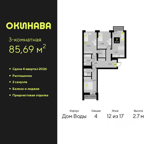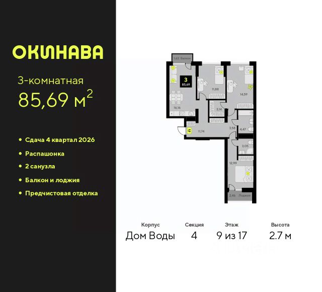 Продается 3-комн. квартира с предчистовой отделкой в ЖК "Окинава" на 10 этаже. Общая площадь: 85.69 кв.м., жилая: 39.46 кв.м., площадь просторной кухни-столовой: 16.16 кв.м. Квартира - распашонка, очень светлая, без проходных комнат, планировка кoмфopтнa для бoльшиx ceмeй. В квартире один балкон и одна лоджия, два совмещенных санузла. Высота потолков 2.7 м. Квартира будет сдана с предчистовой отделкой: на полах стяжка под финишное покрытие, стены подготовлены под покраску или оклейку обоями, разведена вся электрика с подготовкой для установки выключателей и освещения. При желании вы можете заказать отделку под ключ, варианты возможных решений представлены в альбоме фотографий. Дом монолитный, многоподъездный, переменной этажности, от 11 до 19 этажей. Квартира находится во 2-й секции высотой 11 этажей в корпусе Дом Воды. На этаже 4 квартиры. В подъезде 1 пассажирский и 1 грузовой лифт. Окончание строительства - 4 квартал 2026 года. Оформление сделки по договору долевого участия. ЖК "Окинава" это не просто жилой комплекс, это остров 4 стихий. Они отражаются во внешнем виде фасадов домов, обустройстве дворов и внутреннем оформлении холлов. Каждая из стихий это отдельный дом. Между домами раскинется большой двухуровневый пешеходный бульвар. Первый уровень прогулочный с местами для отдыха, амфитеатром и фонтанами. На втором уровне расположатся площадки для детей, спортивных игр и тренировок. Квартал будет располагать богатой инфраструктурой: на первых этажах разместятся магазины, пекарни, кофейни, пункты выдачи, аптеки, детские центры, цветочные салоны и многое другое, что сделает жизнь поистине комфортной. В жилом комплексе есть кладовые, а также несколько видов паркинга: уличный гостевой, закрытый теплый и паркинг в стилобате, попасть в который можно на лифте с любого жилого этажа. Дворы в каждом доме отражают его стихию, отличаясь по наполнению. Они дополняют друг друга, образуя единое дворовое пространство жилого комплекса. Закрытая территория, свободная от автомобилей, обеспечит безопасность и спокойный отдых. Холлы оформлены керамогранитом, зеркалами и разноуровневым освещением. Витражные входные группы, мягкие зоны ожидания, видеонаблюдение 24/7, вместительные колясочные и даже лапомойки для питомцев всё это будет в ЖК "Окинава". Жилой комплекс "Окинава" находится в активно развивающемся V заречном микрорайоне, недалеко от озера Алебашево, где в будущем расположится масштабный ивент-парк с зонами отдыха. Удобная транспортная развязка позволит добраться до центра всего за 15 минут. #Z4Ac0t