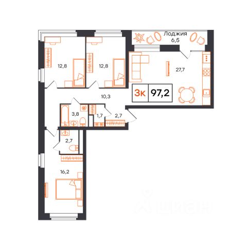 Продаётся 3-комнатная квартира в строящемся доме (Лот 1, секция B (Василия Малкова, 20)), срок сдачи: I-кв. 2027, общей площадью 97.2 кв.м., на 3 этаже. Новый жилой комплекс от застройщика СЗ КВАРТАЛ расположен в городе Тюмень на улице Бориса Прудаева.