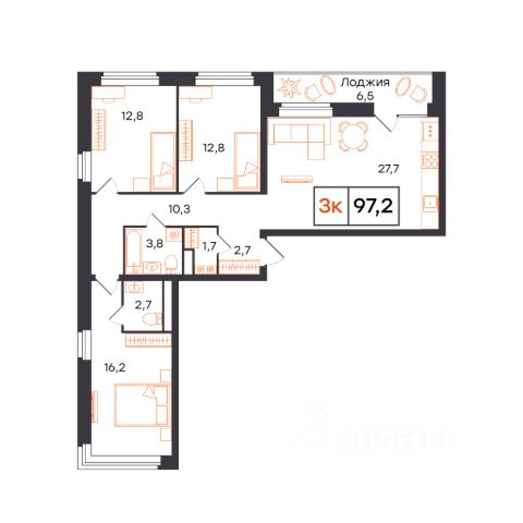 Продаётся 3-комнатная квартира в строящемся доме (Лот 1, секция А (Василия Малкова, 20к1)), срок сдачи: I-кв. 2027, общей площадью 94.4 кв.м., на 7 этаже. Новый жилой комплекс от застройщика СЗ КВАРТАЛ расположен в городе Тюмень на улице Бориса Прудаева.