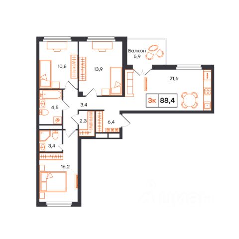 Продаётся 3-комнатная квартира в строящемся доме (Лот 1, секция F (Василия Малкова, 20к3)), срок сдачи: I-кв. 2027, общей площадью 88.4 кв.м., на 2 этаже. Новый жилой комплекс от застройщика СЗ КВАРТАЛ расположен в городе Тюмень на улице Бориса Прудаева.