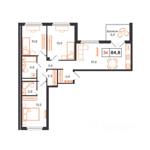 Продаётся 3-комнатная квартира в строящемся доме (Лот 1, секция F (Василия Малкова, 20к3)), срок сдачи: I-кв. 2027, общей площадью 84.8 кв.м., на 5 этаже. Новый жилой комплекс от застройщика СЗ КВАРТАЛ расположен в городе Тюмень на улице Бориса Прудаева.