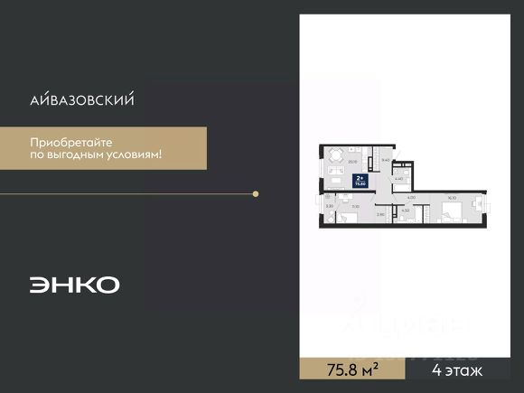 2-комн. квартира от застройщика с предчистовой отделкой в ЖК "Айвазовский" на 4 этаже. Общая площадь: 75.8 кв.м. Высота потолков 2.7 м. Дом монолитный, многоподъездный, переменной этажности, от 14 до 24 этажей. Квартира находится в 1-й секции высотой 20 этажей в корпусе ГП-8. На этаже 6 квартир. В подъезде 1 пассажирский и 1 грузовой лифт. Окончание строительства - 3 квартал 2026 года. Оформление сделки по договору долевого участия. Новый жилой район располагается в живописном месте на берегу Туры в центральной части города. Принципиально новое пространство для жизни в центре современного города для тех, чьи мечты сбываются, кто нацелен на постоянный рост, перемены к лучшему для себя и своих близких. Каждая деталь ЖК "Айвазовский" вдохновляет и заряжает на новые свершения: авторская архитектура, сбалансированная продуманная инфраструктура, дизайнерские дворы со спортивными и детскими площадками, парковые зоны с фонтанами, водный канал, украшающий центральный прогулочный маршрут района и многое другое. В 2019 года проект стал лауреатом престижной премии Urban Awards 2019 в номинации "Лучший строящийся региональный жилой комплекс бизнес-класса". Главная особенность Айвазовский - соседство разных архитектурных школ в рамках одного дома. Изысканная классика, выразительная эклектика и оригинальный модерн - жить в одном из таких домов настоящий повод для гордости. Айвазовский это идеальное сочетание комфорта, технологий и развитой инфраструктуры. Вход в подъезд возможен с улицы и со двора. Отправляясь на работу или за покупками, жители могут выйти с внешней стороны дома, а для прогулки с ребенком со стороны двора. Экологически чистые материалы и энергосберегающие технологии, качественное освещение общественных зон, видеонаблюдение по всей территории жилого района (в том числе в подъездах, лифтах и в подземном паркинге), закрытые дворы с доступом только для жителей Айвазовский. Часть домов в Айвазовский будут оснащены подземным паркингом. Востребованный в нашем климатическом поясе формат хранения автомобилей защитит собственность владельца в любое время года. Аккредитация в банках: ОАО "Альфа-Банк", "Сбербанк России", ПАО "Газпромбанк", ПАО Банк "ВТБ", АО "ДОМ.РФ" и других.