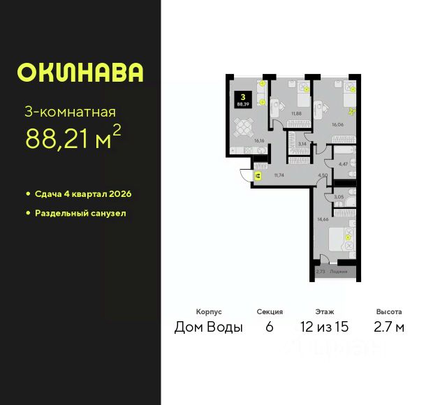 Просторная 3-комн. квартира в ЖК "Окинава" на 12 этаже. Общая площадь: 88.21 кв.м. Высота потолков 2.7 м. Дом монолитный, многоподъездный, переменной этажности, от 11 до 19 этажей. Квартира находится в 6-й секции высотой 15 этажей в корпусе Дом Воды. На этаже 5 квартир. В подъезде 1 пассажирский и 1 грузовой лифт. Окончание строительства - 4 квартал 2026 года. Оформление сделки по договору долевого участия. ЖК "Окинава" это не просто жилой комплекс, это остров 4 стихий. Они отражаются во внешнем виде фасадов домов, обустройстве дворов и внутреннем оформлении холлов. Каждая из стихий это отдельный дом. Между домами раскинется большой двухуровневый пешеходный бульвар. Первый уровень прогулочный с местами для отдыха, амфитеатром и фонтанами. На втором уровне расположатся площадки для детей, спортивных игр и тренировок. Квартал будет располагать богатой инфраструктурой: на первых этажах разместятся магазины, пекарни, кофейни, пункты выдачи, аптеки, детские центры, цветочные салоны и многое другое, что сделает жизнь поистине комфортной. В жилом комплексе есть кладовые, а также несколько видов паркинга: уличный гостевой, закрытый теплый и паркинг в стилобате, попасть в который можно на лифте с любого жилого этажа. Дворы в каждом доме отражают его стихию, отличаясь по наполнению. Они дополняют друг друга, образуя единое дворовое пространство жилого комплекса. Закрытая территория, свободная от автомобилей, обеспечит безопасность и спокойный отдых. Холлы оформлены керамогранитом, зеркалами и разноуровневым освещением. Витражные входные группы, мягкие зоны ожидания, видеонаблюдение 24/7, вместительные колясочные и даже лапомойки для питомцев всё это будет в ЖК "Окинава". Жилой комплекс "Окинава" находится в активно развивающемся V заречном микрорайоне, недалеко от озера Алебашево, где в будущем расположится масштабный ивент-парк с зонами отдыха. Удобная транспортная развязка позволит добраться до центра всего за 15 минут.
