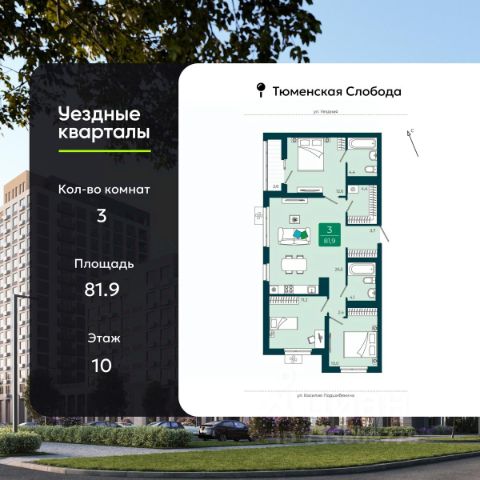 Продается трехкомнатная квартира в ЖК "Уездные кварталы" на 9 этаже. Квартира без отделки, новый владелец может сделать ремонт по своему проекту. Общая площадь: 82.81 кв.м., жилая: 39.01 кв.м., площадь просторной кухни-столовой: 20.74 кв.м. Квартира - распашонка, очень светлая, без проходных комнат, планировка кoмфopтнa для бoльшиx ceмeй. В квартире одна лоджия, один совмещенный и один раздельный санузел. Высота потолков 2.7 м. Дом монолитный, многоподъездный, переменной этажности, от 7 до 17 этажей. Квартира находится во 2-й секции высотой 12 этажей в корпусе ГП-3. На этаже 11 квартир. В подъезде 1 пассажирский и 1 грузовой лифт. В настоящее время строительство завершено, дом сдан в 1 квартале 2026 года. Оформление сделки по договору купли-продажи. "Уездные кварталы" - семейный жилой комплекс комфорт-класса с авторской архитектурой и трехуровневым ландшафтным озеленением. Рядом расположены крупные транспортные развязки, которые позволяют добраться в любую точку города за 15 минут. Жилой комплекс находится в современном районе с развитой инфраструктурой, на первой линии Тюменской Слободы. Вокруг есть всё необходимое в шаговой доступности: новые детские сады и школы, остановки общественного транспорта, магазины, кафе и рестораны, поликлиника, детская школа искусств, парки и спортивный комплекс. На первых этажах квартала расположена собственная коммерческая сеть, а также свой соседский центр. Проект включает 5 домов переменной этажности с более чем 100 планировками - с террасами, французскими балконами и мастер-спальнями. Закрытые дворы оборудованы интерактивными площадками для игр, спортивными зонами и местами тихого отдыха. Вдоль жилого комплекса расположен пешеходный бульвар с сухим фонтаном, а для автомобилей предусмотрен теплый паркинг. Часть квартир можно приобрести с ремонтом, мебелью и техникой от застройщика, а расходы включить в ипотечный платеж.