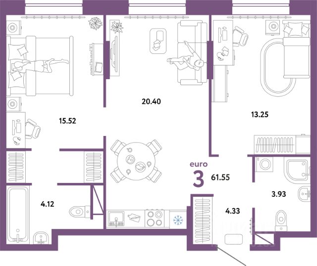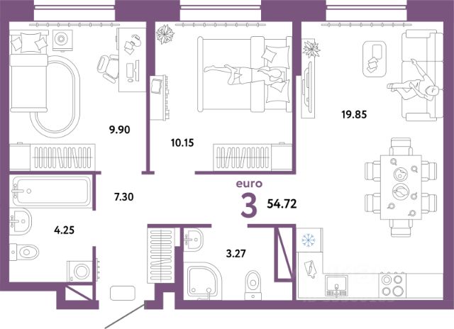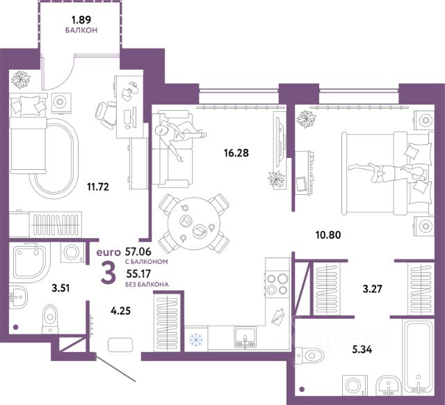 Два санузла, 6,28 и 2,94 кв.м. позволят разместить ванну, душевую кабину, а так же организовать постирочное пространство.