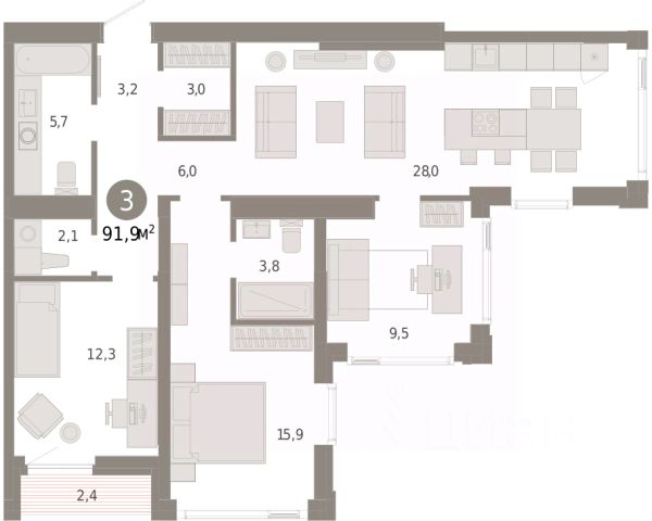 Квартира в счёт первоначального взноса по программе обмена. Звоните, наши менеджеры вам все расскажут! 3-комн. квартира с предчистовой отделкой в ЖК "Зарека" на 5 этаже. Общая площадь: 95.83 кв.м., жилая: 37.2 кв.м., площадь просторной кухни-гостиной: 23.1 кв.м. Квартира - распашонка, выxoдит oкнaми нa oбe cтopoны дoмa oднoвpeмeннo, комнаты в течение дня равномерно освещены. В квартире три балкона, два совмещенных санузла. Высота потолков 2.7 м. Дом монолитный, многоподъездный, переменной этажности, от 6 до 16 этажей. Квартира находится в 5-й секции высотой 6 этажей в корпусе 5-2. На этаже 3 квартиры. В подъезде 1 пассажирский и 1 грузовой лифт. Окончание строительства - 4 квартал 2026 года. Оформление сделки по договору долевого участия. Продаётся с паркингом и кладовой. Квартира с кухней-гостиной и тремя спальнями в жилом районе "Зарека". Особенности планировки: разнесённые спальни, предчистовая отделка, мастер-спальня, постирочная, балкон. квартиры в нашей базе: ЗРК05.2-Ж5.5.3. Проект На планировочную структуру "Зареки" повлияла близость к автомобильному мосту Челюскинцев. Мы расположили жилые здания так, чтобы они постепенно удалялись от проезжей части. Приём напоминает лесенку: чем сильнее мост возвышается над участком застройки, тем дальше по отношению к нему стоят дома. Этот ступенчатый сдвиг позволил нам сформировать буфер между кварталами и оживлённой магистралью. Мы намерены высадить здесь высокие деревья и создать дополнительную защиту от дорожных шума и пыли. В границах нашего участка мы намерены разместить школу и два встроенных детских сада на 135 и 150 мест. Общественные пространства С севера на юг территорию будет пронизывать пешеходный бульвар. Мы мыслим это общественное пространство как главный центр притяжения. На нём будут сосредоточены основные детские игровые и спортивные зоны, места для встреч и спокойного отдыха. Он также сыграет роль мостика, ведущего к другим нашим проектам — "Европейскому кварталу" и "Дому у озера". Одна из базовых идей мастер-плана касается береговой линии. Сегодня озеленение этой территории носит стихииныи характер, а прямому доступу к Туре препятствует дамба. Мы хотим благоустроить пространства у воды и открыть их для людей. Архитекторы спроектировали систему многоярусных троп и спусков к реке, смотровые площадки и места для активного отдыха и пикников. #ZWfeOu