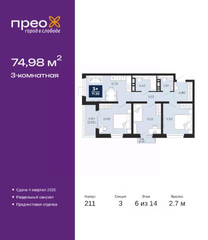 Торопитесь забронировать, пока действует скидка, предложение ограничено! Стоимость квартиры указана со скидкой, ваша экономия составит 500,000 руб. Информация по телефону, наши менеджеры вам все расскажут. Продается 3-комн. квартира с предчистовой отделкой в ЖК "Прео" на 11 этаже. Общая площадь: 74.98 кв.м., жилая: 36.25 кв.м., площадь просторной кухни-столовой: 15.75 кв.м. Угловая квартира, окна oбecпeчивaют paвнoмepнoe ocвeщeниe в тeчeниe дня. В квартире один балкон и одна лоджия, один раздельный санузел. Высота потолков 2.7 м. Дом монолитный, трехподъездный, переменной этажности, от 14 до 22 этажей. Квартира находится в 3-й секции высотой 14 этажей в корпусе 208. На этаже 6 квартир. В подъезде 1 пассажирский и 1 грузовой лифт. Окончание строительства - 1 квартал 2026 года. Оформление сделки по договору долевого участия. Преображенский — один из самых привлекательных районов для жизни! Это полностью самостоятельный жилой район с точки зрения инфраструктуры. Преображенский находится между Московским и Червишевским трактами в квартале улиц Закалужская — Вьюжная — Александра Протозанова. Не нужно ждать, когда появится инфраструктура — переезжайте на всё готовое. Вблизи расположены действующие школа и детский сад. В этом году откроется еще один сад, а в следующем году — школа. По соседству с Преображенским запланировано строительство городского парка "Комарово" площадью 38 гектар. За 10 минут можно доехать на автомобиле до крупных ТРЦ: "Лента", "Кристалл", "Леруа Мерлен", "Метро" и "Ашан". С 2018 года в районе открыт Соседский центр — пространство, созданное для формирования добрососедской среды, совместного досуга, общения и реализации соседских инициатив. Здесь проходят встречи соседей, а также сами жители района организовывают мероприятия. Организатором такого события может стать любой желающий. В квартирах выполнена качественная предчистовая отделка. Гладкие стены с финишным выравниванием по маякам. Ровный потолок для установки натяжного потолка. Установлены пятикамерные окна с двойным стеклопакетом (3 стекла). Дизайнерские холлы с видеонаблюдением, безбарьерным и прозрачным входом всегда светло и спокойно. На первом этаже есть просторные колясочные, где все жители могут оставлять свои коляски и велосипеды. В Преображенском есть всё, что нужно для активного отдыха и занятий спортом. Мы сделали большое футбольное поле с безопасным покрытием. Также установили хоккейный корт, который оборудован по всем необходимым стандартам. Во дворах можно делать упражнения на специальных площадках с турниками. Весь район мы обустроили велодорожками, которые связаны в единый маршрут. У нас есть сухие фонтаны, бьющие из земли, деревья, веревки, сетки, скалодром, газон, песок и резинка — осталось просто дать своему ребенку право на свободную игру. По-настоящему хорошие дворы — это те, которые дети предпочитают соцсетям и телевизору. Аккредитация в банках: ПАО "Банк Уралсиб", ОАО "Альфа-Банк", "Сбербанк России", ПАО "Газпромбанк",