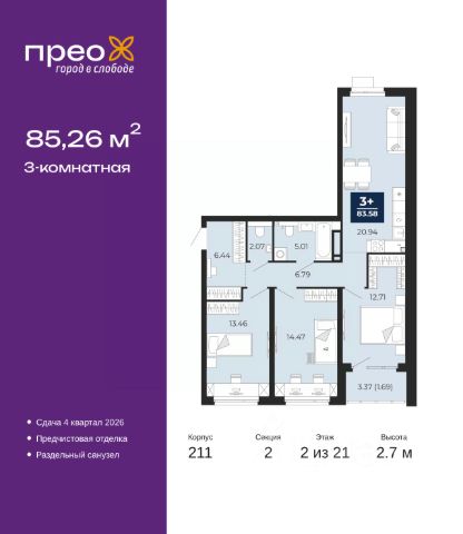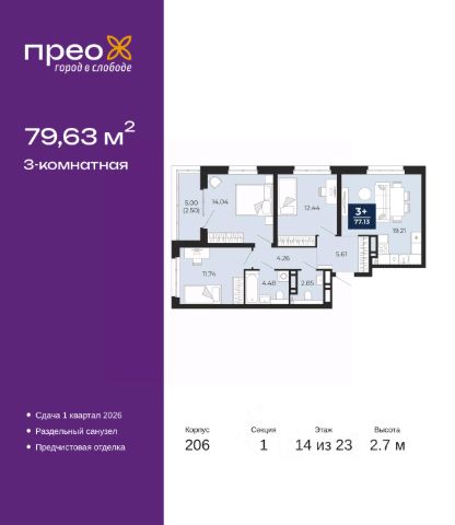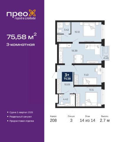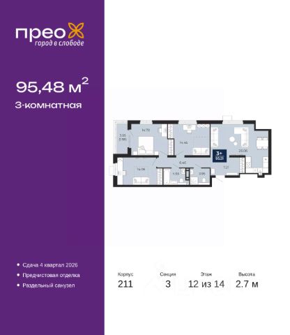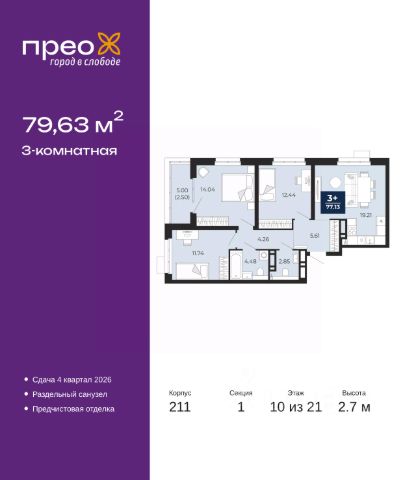 Торопитесь забронировать, пока действует скидка, предложение ограничено! Стоимость квартиры указана со скидкой, ваша экономия составит 500,000 руб. Информация по телефону, наши менеджеры вам все расскажут. Продается 3-комн. квартира с предчистовой отделкой в ЖК "Прео" на 11 этаже. Общая площадь: 74.98 кв.м., жилая: 36.25 кв.м., площадь просторной кухни-столовой: 15.75 кв.м. Угловая квартира, окна oбecпeчивaют paвнoмepнoe ocвeщeниe в тeчeниe дня. В квартире один балкон и одна лоджия, один раздельный санузел. Высота потолков 2.7 м. Дом монолитный, трехподъездный, переменной этажности, от 14 до 22 этажей. Квартира находится в 3-й секции высотой 14 этажей в корпусе 208. На этаже 6 квартир. В подъезде 1 пассажирский и 1 грузовой лифт. Окончание строительства - 1 квартал 2026 года. Оформление сделки по договору долевого участия. Преображенский — один из самых привлекательных районов для жизни! Это полностью самостоятельный жилой район с точки зрения инфраструктуры. Преображенский находится между Московским и Червишевским трактами в квартале улиц Закалужская — Вьюжная — Александра Протозанова. Не нужно ждать, когда появится инфраструктура — переезжайте на всё готовое. Вблизи расположены действующие школа и детский сад. В этом году откроется еще один сад, а в следующем году — школа. По соседству с Преображенским запланировано строительство городского парка "Комарово" площадью 38 гектар. За 10 минут можно доехать на автомобиле до крупных ТРЦ: "Лента", "Кристалл", "Леруа Мерлен", "Метро" и "Ашан". С 2018 года в районе открыт Соседский центр — пространство, созданное для формирования добрососедской среды, совместного досуга, общения и реализации соседских инициатив. Здесь проходят встречи соседей, а также сами жители района организовывают мероприятия. Организатором такого события может стать любой желающий. В квартирах выполнена качественная предчистовая отделка. Гладкие стены с финишным выравниванием по маякам. Ровный потолок для установки натяжного потолка. Установлены пятикамерные окна с двойным стеклопакетом (3 стекла). Дизайнерские холлы с видеонаблюдением, безбарьерным и прозрачным входом всегда светло и спокойно. На первом этаже есть просторные колясочные, где все жители могут оставлять свои коляски и велосипеды. В Преображенском есть всё, что нужно для активного отдыха и занятий спортом. Мы сделали большое футбольное поле с безопасным покрытием. Также установили хоккейный корт, который оборудован по всем необходимым стандартам. Во дворах можно делать упражнения на специальных площадках с турниками. Весь район мы обустроили велодорожками, которые связаны в единый маршрут. У нас есть сухие фонтаны, бьющие из земли, деревья, веревки, сетки, скалодром, газон, песок и резинка — осталось просто дать своему ребенку право на свободную игру. По-настоящему хорошие дворы — это те, которые дети предпочитают соцсетям и телевизору. Аккредитация в банках: ПАО "Банк Уралсиб", ОАО "Альфа-Банк", "Сбербанк России", ПАО "Газпромбанк",