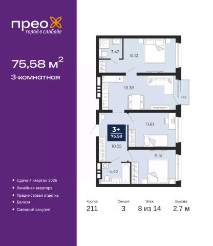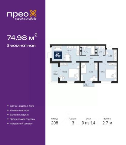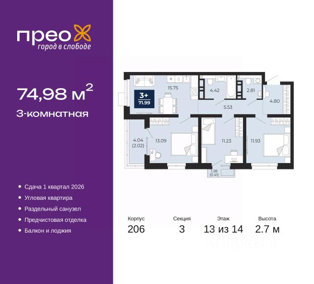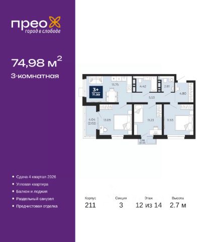 Торопитесь оформить бронирование по акционной цене, срок акции ограничен! Стоимость квартиры указана со скидкой, ваша экономия составит 500,000 руб. Звоните, мы вам все подробно расскажем. 3-комн. квартира от застройщика с предчистовой отделкой в ЖК "Прео" на 12 этаже. Общая площадь: 74.98 кв.м., жилая: 36.25 кв.м., площадь просторной кухни-столовой: 15.75 кв.м. Квартира угловая, очень светлая, естественная вентиляция при открытии окон. В квартире один балкон и одна лоджия, один раздельный санузел. Высота потолков 2.7 м. Дом монолитный, черырехподъездный, переменной этажности, от 14 до 21 этажей. Квартира находится в 3-й секции высотой 14 этажей в корпусе 211. На этаже 6 квартир. В подъезде 1 пассажирский и 1 грузовой лифт. Окончание строительства - 4 квартал 2026 года. Оформление сделки по договору долевого участия. Преображенский — один из самых привлекательных районов для жизни! Это полностью самостоятельный жилой район с точки зрения инфраструктуры. Преображенский находится между Московским и Червишевским трактами в квартале улиц Закалужская — Вьюжная — Александра Протозанова. Не нужно ждать, когда появится инфраструктура — переезжайте на всё готовое. Вблизи расположены действующие школа и детский сад. В этом году откроется еще один сад, а в следующем году — школа. По соседству с Преображенским запланировано строительство городского парка "Комарово" площадью 38 гектар. За 10 минут можно доехать на автомобиле до крупных ТРЦ: "Лента", "Кристалл", "Леруа Мерлен", "Метро" и "Ашан". С 2018 года в районе открыт Соседский центр — пространство, созданное для формирования добрососедской среды, совместного досуга, общения и реализации соседских инициатив. Здесь проходят встречи соседей, а также сами жители района организовывают мероприятия. Организатором такого события может стать любой желающий. В квартирах выполнена качественная предчистовая отделка. Гладкие стены с финишным выравниванием по маякам. Ровный потолок для установки натяжного потолка. Установлены пятикамерные окна с двойным стеклопакетом (3 стекла). Дизайнерские холлы с видеонаблюдением, безбарьерным и прозрачным входом всегда светло и спокойно. На первом этаже есть просторные колясочные, где все жители могут оставлять свои коляски и велосипеды. В Преображенском есть всё, что нужно для активного отдыха и занятий спортом. Мы сделали большое футбольное поле с безопасным покрытием. Также установили хоккейный корт, который оборудован по всем необходимым стандартам. Во дворах можно делать упражнения на специальных площадках с турниками. Весь район мы обустроили велодорожками, которые связаны в единый маршрут. У нас есть сухие фонтаны, бьющие из земли, деревья, веревки, сетки, скалодром, газон, песок и резинка — осталось просто дать своему ребенку право на свободную игру. По-настоящему хорошие дворы — это те, которые дети предпочитают соцсетям и телевизору. Аккредитация в банках: ОАО "Альфа-Банк", ПАО Банк "ВТБ", ПАО "Газпромбанк", ПАО "Банк Уралсиб", "Сбербан