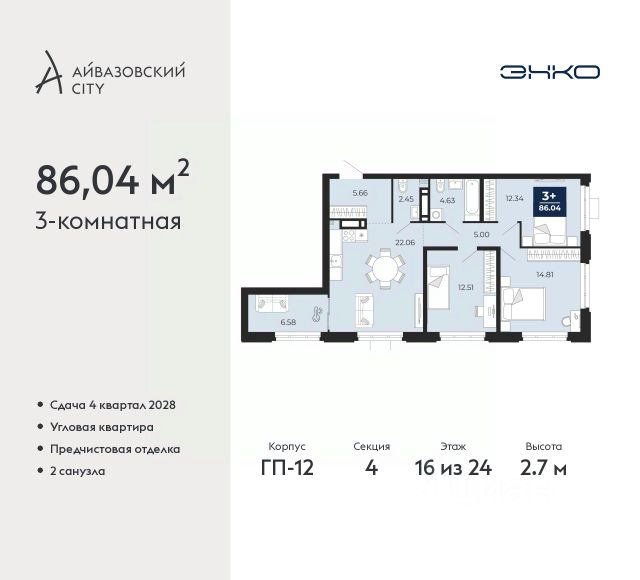 Квартира с кухней-гостиной и тремя спальнями в кварталах "На Минской". Особенности планировки: вид во двор, лоджия, разнесённые спальни, предчистовая отделка, мастер-спальня, постирочная, балкон.
