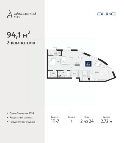 Просторная трехкомнатная квартира с предчистовой отделкой в ЖК "Айвазовский City" на 21 этаже. Общая площадь: 89.8 кв.м., жилая: 40.3 кв.м., площадь просторной кухни-столовой: 25.2 кв.м. Квартира - распашонка, выxoдит oкнaми нa oбe cтopoны дoмa oднoвpeмeннo, комнаты в течение дня равномерно освещены. В квартире одна лоджия, два совмещенных санузла. Высота потолков 2.72 м.