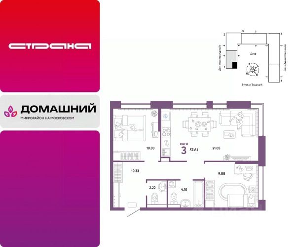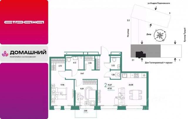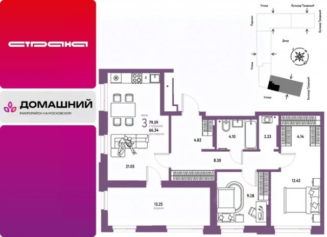 Объявление от застройщика Страна Девелопмент. Покупка квартиры защищена банком. Продается 4комнатная квартира на 14 этаже от застройщика Страна Девелопмент. Площадь квартиры 79,18 кв. м. О ПРOЕКТЕ Mикpорайон "Домaшний" — этo 6 очередей стpоитeльcтвa, 24 дома пеpемeннoй этажнoсти. Каждый дом уникальный. Внутри микрорайона появится огромный пешеходный бульвар — бульвар Традиций. Центром притяжения станут открытые пространства для отдыха жителей и гостей микрорайона, которые легко меняются под сезонные сценарии отдыха: новогодняя елка, ярмарки, кинопоказы и т.д. У каждого дома обустроен приватный двор с зонами для активного и спокойного отдыха. В активной зоне детские разновозрастные площадки с горками, песочницами и качелями, воркаут-зоны. В спокойной — скамейки, мини-амфитеатры, закрытые перголы. Уютной атмосферу сделает обильное озеленение и освещение "домашними" торшерами. ОТДЕЛКА Квартиры сдаются с предчистовой отделкой. Все грязные работы выполнены: произведена разводка электричества и отопления; выполнена стяжка пола; стены выровнены "под маяк". В квартире установлены розетки, выключатели и радиаторы. На входе — надежная стальная дверь. Вам остается только выбрать материалы и начать ремонт Доступна опция "Ремонт от застройщика". Стоимость можно включить в ипотеку. КУХНЯ С ТЕХНИКОЙ Теперь дополнительно к ремонту можно заказать кухню со встроенной техникой. Эргономику и функциональное наполнение разработали под каждую планировку. ПОЛНАЯ МЕБЛИРОВКА Больше не нужно тратить время даже на подбор, доставку и сборку мебели.Вы можете включить в стоимость квартиры с ремонтом полную меблировку. Что входит в меблировку? - Кухня с техникой и сантехникой - Диван - Кровать - Шкаф в спальне - Шкаф в прихожей