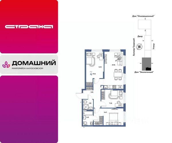 Новая квартира в ЖК "Домашний" напрямую от федеральной группы компаний "Страна Девелопмент". Финансовый партнер — банк "ДОМ.РФ". Продается 4комнатная квартира на 14 этаже от застройщика Страна Девелопмент. Площадь квартиры 76,64 кв. м. Стоимость указана без учета акций. Жилой комплекс "Домашний" это первый цифровой район в Сибири, где жители заходят в парадные по Face ID, автомобили заезжают в паркинг по сканированию номера, а лифт автоматически спускается на первый этаж при открытии домофона. Даже во дворах — USB-розетки и беседки с подогревом. ПРЕИМУЩЕСТВА: -Школа, зеленый сквер и пешеходный бульвар прямо внутри квартала -Закрытые дворы у каждого дома для активного и спокойного отдыха -Охрана, видеонаблюдение 24/7 и доступ к камерам в мобильном приложении -Сквозные парадные с прозрачными входными группами, колясочными и велосипедными -Паркинг с въездом по считыванию номеров, системой контроля выбросов CO2, тележками для покупок и велопарковкой -Торговая галерея на первом этаже дома ОТДЕЛКА Квартиры сдаются с предчистовой отделкой: произведена разводка электричества и отопления, выполнена стяжка пола, стены выровнены "под маяк", установлены розетки, выключатели и радиаторы. ДИЗАЙНЕРСКАЯ ОТДЕЛКА При покупке квартиры в ЖК "Домашний" можно включить стоимость ремонта в ипотеку. Пять вариантов на выбор: Хлопковая нить, Серый шторм, Белый камень, Шалфей, Голубой вереск. СПОСОБЫ ПОКУПКИ: - ипотека - материнский капитал -100% оплата наличными Сотрудники "Страна Девелопмент" будут сопровождать вас на каждом этапе сделки, помогут получить одобрение по ипотеке или снизить ежемесячный платеж.