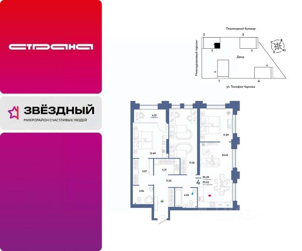 Продается 4комнатная квартира от застройщика "Страна Девелопмент". Квартира на 14 этаже, площадь квартиры 99,39 кв. м. Сдача — в 3 квартале 2025 года. Четыре 32-этажные башни со смещенными осями, объединенные общим стилобатом. На крыше дома появятся детские и спортивные площадки, зоны для релакса и отдыха. А в самом стилобате — торговая галерея и паркинг. У жителей будет свой сад с площадкой для йоги и воркаута, а еще с лаунж-зонами для чтения книг и пикников в тени деревьев. Пока вы занимаетесь спортом или отдыхаете, дети смогут вдоволь набегаться на детских площадках. "Звездном" есть планировочные решения под потребности каждой семьи. Среди их особенностей — просторные кухни-гостиные, мастер-спальни, гардеробные и кладовые. А для тех, кто ищет особенный вариант — двухуровневые квартиры с отдельным входом и квартиры с бильярдной или фитнес-залом. ОТДЕЛКА: Мы сдаем квартиры с предчистовой отделкой. Всё уже готово к ремонту: выведена разводка электричества и отопления, выполнена стяжка пола, стены выровнены. Вам останется выбрать материалы и приступить к ремонту. При покупке квартиры в ЖК "Звездный" можно включить стоимость ремонта в ипотеку. Застройщик предлагает три варианта цветовых решений: натуральный, светлый или тёмный. СПОСОБЫ ПОКУПКИ: Сотрудники Страны Девелопмент будут сопровождать вас на каждом этапе сделки, помогут получить одобрение по ипотеке или снизить ежемесячный платеж. -Ипотека -Материнский капитал -100% оплата наличными