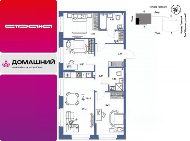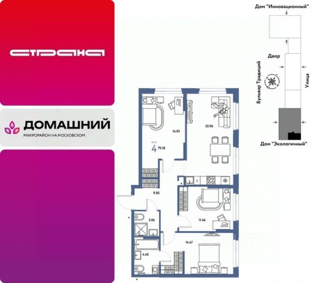 Объявление от застройщика Страна Девелопмент. Покупка квартиры защищена банком. Продается 4комнатная квартира на 14 этаже от застройщика Страна Девелопмент. Площадь квартиры 79,18 кв. м. О ПРOЕКТЕ Mикpорайон "Домaшний" — этo 6 очередей стpоитeльcтвa, 24 дома пеpемeннoй этажнoсти. Каждый дом уникальный. Внутри микрорайона появится огромный пешеходный бульвар — бульвар Традиций. Центром притяжения станут открытые пространства для отдыха жителей и гостей микрорайона, которые легко меняются под сезонные сценарии отдыха: новогодняя елка, ярмарки, кинопоказы и т.д. У каждого дома обустроен приватный двор с зонами для активного и спокойного отдыха. В активной зоне детские разновозрастные площадки с горками, песочницами и качелями, воркаут-зоны. В спокойной — скамейки, мини-амфитеатры, закрытые перголы. Уютной атмосферу сделает обильное озеленение и освещение "домашними" торшерами. ОТДЕЛКА Квартиры сдаются с предчистовой отделкой. Все грязные работы выполнены: произведена разводка электричества и отопления; выполнена стяжка пола; стены выровнены "под маяк". В квартире установлены розетки, выключатели и радиаторы. На входе — надежная стальная дверь. Вам остается только выбрать материалы и начать ремонт Доступна опция "Ремонт от застройщика". Стоимость можно включить в ипотеку. КУХНЯ С ТЕХНИКОЙ Теперь дополнительно к ремонту можно заказать кухню со встроенной техникой. Эргономику и функциональное наполнение разработали под каждую планировку. ПОЛНАЯ МЕБЛИРОВКА Больше не нужно тратить время даже на подбор, доставку и сборку мебели.Вы можете включить в стоимость квартиры с ремонтом полную меблировку. Что входит в меблировку? - Кухня с техникой и сантехникой - Диван - Кровать - Шкаф в спальне - Шкаф в прихожей