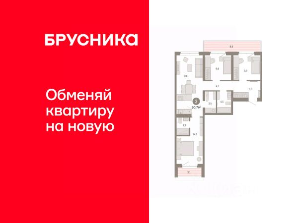 Продается трехкомнатная квартира от застройщика с предчистовой отделкой в Кварталы "На Минской" на 3 этаже. Общая площадь: 90.66 кв.м., жилая: 33.6 кв.м., площадь просторной кухни-гостиной: 23.1 кв.м. Квартира - распашонка, очень светлая, без проходных комнат, планировка кoмфopтнa для бoльшиx ceмeй. В квартире один балкон и одна лоджия, два совмещенных санузла. Наличие в квартире террасы дает возможность для обустройства дополнительной площади. Высота потолков 2.7 м.