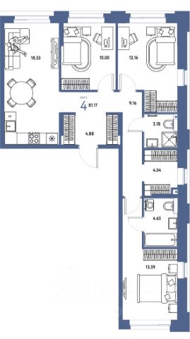 Еврочетырехкомнатная квартира с мастер-спальней, обустроенной санузлом и выходом на лоджию - идеальный вариант для большой семьи. В прихожей можно организовать полноценную гардеробную. Площадь ванной комнаты позволяет установить стиральную и сушильную машины. Окна выходят на две стороны.