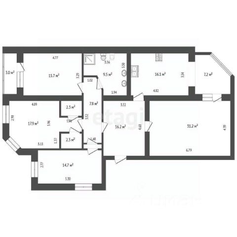 Гармоничная комфортная планировка - одно из безусловных достоинств квартиры, включает в себя просторную кухню-гостиную-столовую 30 кв.м, расположенную по центру, налево от нее расположена мастер-спальня с гардеробной и своим приватным сан.узлом, направо располагаются две просторные 16 и 19 кв.м детские, ещё один сан.узел и гардеробная.