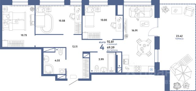 Квартира 3+ с окнами на 2 стороны Самая популярная по спросу квартира это квартира с окнами на 2 стороны света! Здесь идеально все! • Просторная кухня-гостиная с широким окном • Спальня с выделенной зоной, которую вы можете использовать как кабинет или зону отдыха • 2 детские с видом на двор и променад • Французский балкон • Два удобных санузла, где вместится все необходимое • Вместительный двойной холл с двумя нишами под шкафы-купе
