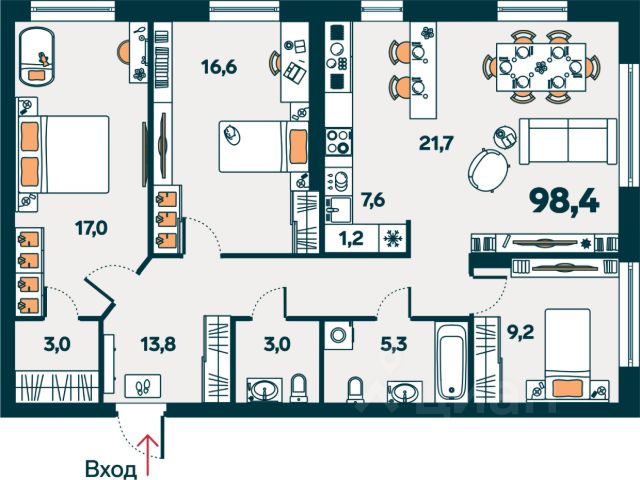 Квартира в рассрочку без процентов от застройщика. Эксклюзивные ипотечные условия. Дом будет сдан в 4 квартале 2025 года. Звоните, наши менеджеры вам все расскажут. Просторная 4-комн. квартира с предчистовой отделкой в ЖК "Республики 205" на 7 этаже. Общая площадь: 138.81 кв.м., жилая: 52.6 кв.м., площадь просторной кухни-гостиной: 44.9 кв.м. Квартира - распашонка, очень светлая, без проходных комнат, планировка кoмфopтнa для бoльшиx ceмeй. В квартире одна лоджия, три совмещенных санузла. Высота потолков 2.6 м. Купить квартиру можно с помощью программ покупки от застройщика Брусника: - ипотека по эксклюзивной ставке с помощью в получении положительного кредитного решения через сервис ипотечный брокер; - квартиры в рассрочку без процентов от застройщика Брусника; - обмен квартиры на новую. Получить одобрение ипотеки или рассрочку, а также осуществить обмен квартир можно онлайн. Дом монолитный, многоподъездный, переменной этажности, от 9 до 17 этажей. Квартира находится в 6-й секции высотой 15 этажей в корпусе 1. На этаже 7 квартир. В подъезде 1 пассажирский и 1 грузовой лифт. Начало строительства - 2 квартал 2023 года. В настоящее время строительство завершено, дом сдан в 4 квартале 2025 года. Оформление сделки по договору купли-продажи. Район Проект расположен в границах улиц Пермякова, Энергетиков, Воровского и Республики. До центра города — 10 минут на машине. Рядом — автомобильная развязка на пересечении улиц Пермякова и Республики. В шаговой доступности есть школы, детские сады, поликлиники, крупный торговый центр, автовокзал и несколько скверов. Проект "Республики 205" — это проект комплексного развития территории, уникальный по своему наполнению. Переосмысляя бывшую территорию завода медицинского оборудования, мы создадим новое место силы — микрорайон, насыщенный деловой, развлекательной, рекреационной, игровой, образовательной и медицинской инфраструктурой. До каждого полезного сервиса здесь можно будет дойти за 15 минут. Локальными центрами "Республики 205" будут общественные пространства — скверы, парки, бульвары и площади. В границах нашего участка мы намерены разместить школу, рассчитанную на 1550 учеников, два детских сада на 300 мест и встроенный детский сад на 100 мест. В одном из цехов бывшего завода расположится креативный кластер "Кузница". Он станет площадкой для нескольких институций — галереи, лектория, книжного магазина-библиотеки, кинобара и точек креативного pop-up-ритейла. Пешеходные бульвары внутри района соединят между собой улицу ресторанов, детские и спортивные площадки, событийную площадь и летний кинотеатр. Идентификатор квартиры по базе застройщика: МЕД01-01-6-6. #2lglTz Продам 4-комнатную квартиру в монолитном доме в Тюмени.