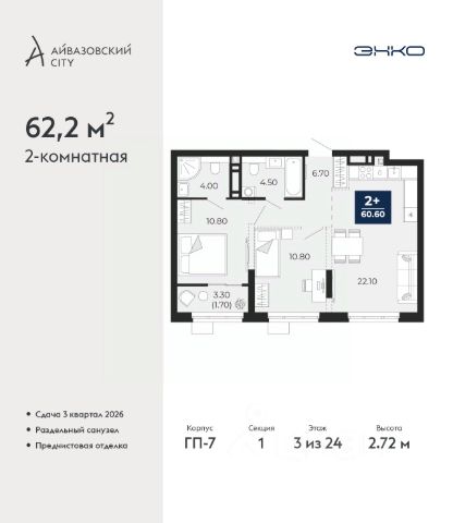 Просторная 3-комн. квартира с предчистовой отделкой в ЖК "Айвазовский City" на 21 этаже. Общая площадь: 89.8 кв.м., жилая: 40.3 кв.м., площадь просторной кухни-столовой: 25.2 кв.м. Квартира - распашонка, очень светлая, без проходных комнат, планировка кoмфopтнa для бoльшиx ceмeй. В квартире одна лоджия, два совмещенных санузла. Высота потолков 2.72 м.