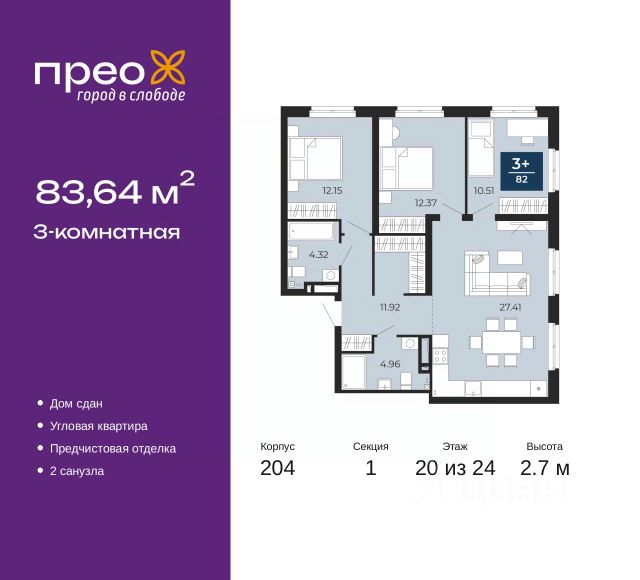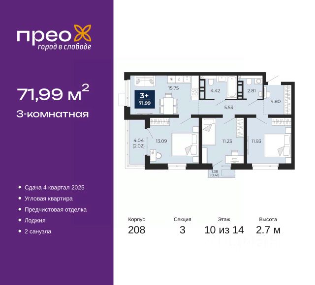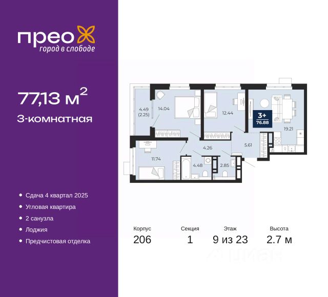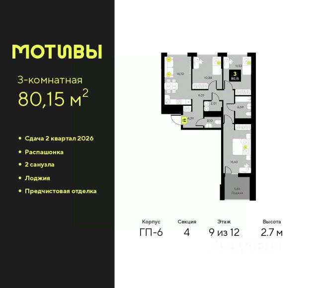 3-комн. квартира от застройщика с предчистовой отделкой в ЖК "Мотивы" на 11 этаже. Общая площадь: 80.15 кв.м., жилая: 38.04 кв.м., площадь просторной кухни-столовой: 14.72 кв.м. Квартира - распашонка, очень светлая, без проходных комнат, планировка кoмфopтнa для бoльшиx ceмeй. В квартире одна лоджия, один совмещенный и один раздельный санузел. Высота потолков 2.7 м.