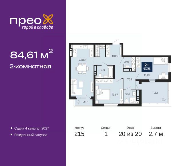 Дом монолитный, черырехподъездный, переменной этажности, от 12 до 14 этажей. Квартира находится в 4-й секции высотой 12 этажей в корпусе ГП-6. На этаже 5 квартир. В подъезде 1 пассажирский и 1 грузовой лифт. Окончание строительства - 2 квартал 2026 года. Оформление сделки по договору долевого участия.