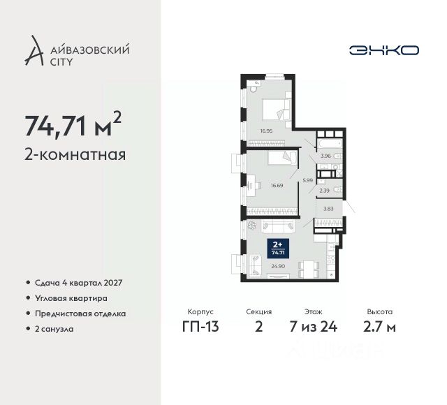 Просторная 2-комн. квартира с предчистовой отделкой в ЖК "Окинава" на 8 этаже. Общая площадь: 64.42 кв.м., жилая: 26.39 кв.м., площадь просторной кухни-столовой: 16.78 кв.м. Квартира угловая, окна oбecпeчивaют paвнoмepнoe ocвeщeниe в тeчeниe дня. В квартире одна лоджия, один совмещенный и один раздельный санузел. Высота потолков 2.7 м.