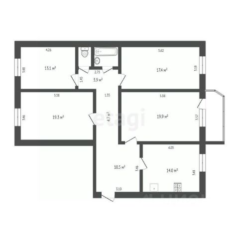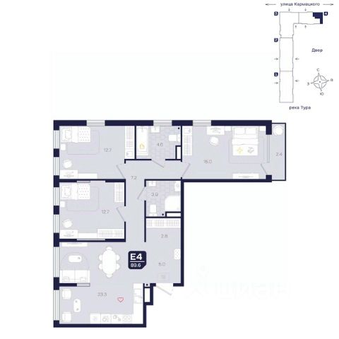 Квартира с кухней-гостиной и четырьмя спальнями в Доме у озера. Особенности планировки: вид во двор, второй санузел, гардеробная, зенитное окно, лоджия, мастер-спальня, окна в пол, окно в санузле, отдельный вход, постирочная, предчистовая отделка, таунхаус, терраса на крыше, тёплая лоджия.