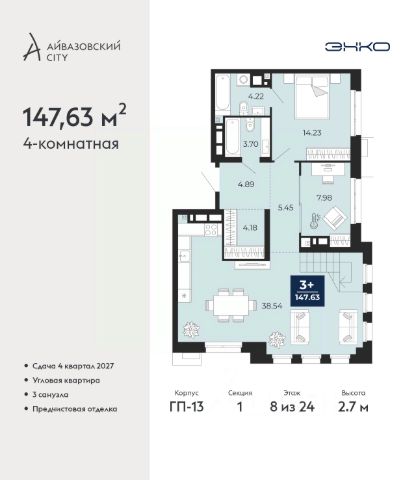 Продается 4-комн. квартира от застройщика с предчистовой отделкой в ЖК "Дом у озера" на 1 этаже. Общая площадь: 170.69 кв.м., жилая: 54.5 кв.м., площадь просторной кухни-гостиной: 22.7 кв.м. Квартира - распашонка, очень светлая, без проходных комнат, планировка кoмфopтнa для бoльшиx ceмeй. В квартире один балкон и одна лоджия, три совмещенных и один раздельный санузел. Высота потолков 2.7 м.
