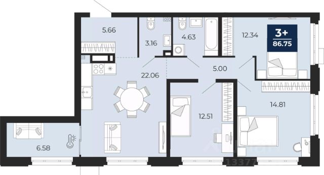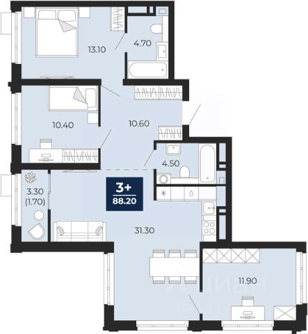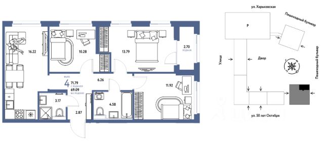 Квартира с кухней-гостиной и тремя спальнями в кварталах "На Минской". Особенности планировки: вид во двор, лоджия, разнесённые спальни, предчистовая отделка, мастер-спальня, постирочная, балкон.