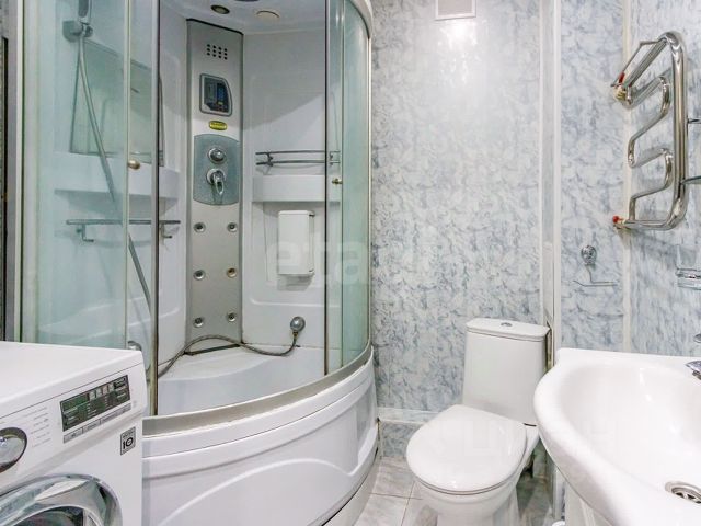 В ванной, стены и пол плитка, большая угловая ванна, заменены все трубы,на воду установлены счетчики учета, прошедшие поверку.
