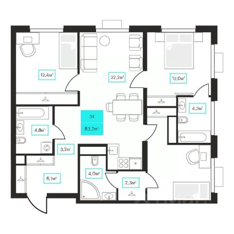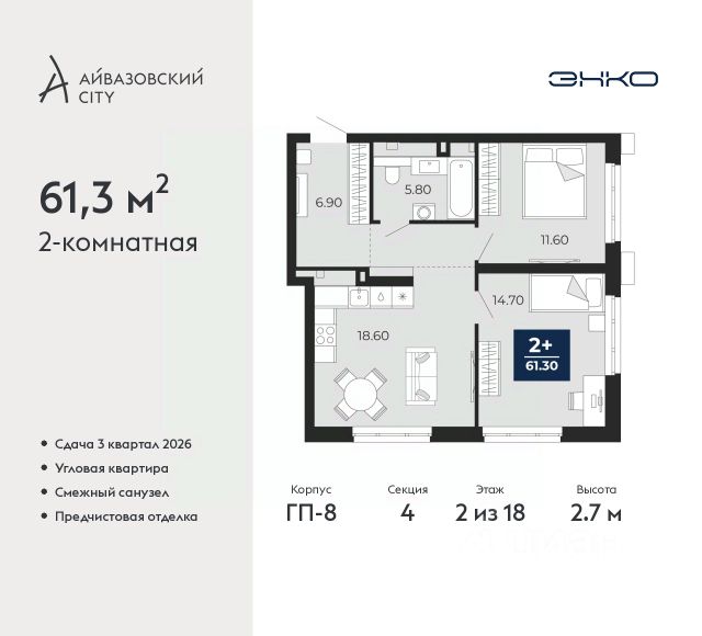 Продается 2-комн. квартира с предчистовой отделкой в ЖК "Айвазовский City" на 2 этаже. Общая площадь: 61.3 кв.м., жилая: 26.3 кв.м., площадь просторной кухни-столовой: 18.6 кв.м. Угловая квартира, очень светлая, естественная вентиляция при открытии окон. В квартире один совмещенный санузел. Высота потолков 2.7 м.