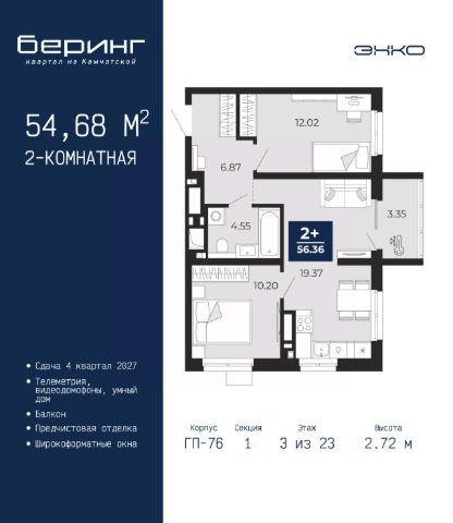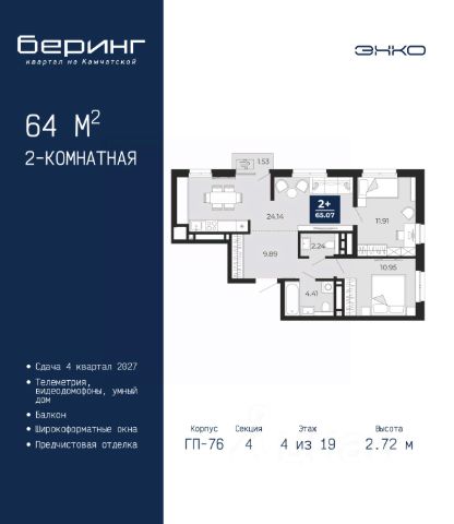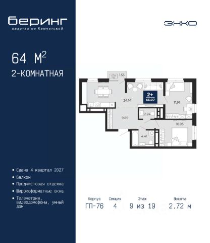 Двухкомнатная квартира от застройщика с предчистовой отделкой в ЖК "Беринг" на 4 этаже. Общая площадь: 64 кв.м., жилая: 22.86 кв.м., площадь просторной кухни-столовой: 24.14 кв.м. Угловая квартира, очень светлая, естественная вентиляция при открытии окон. В квартире один балкон, один совмещенный и один раздельный санузел. Высота потолков 2.72 м.