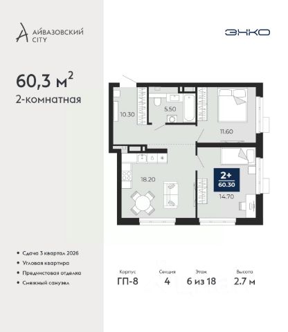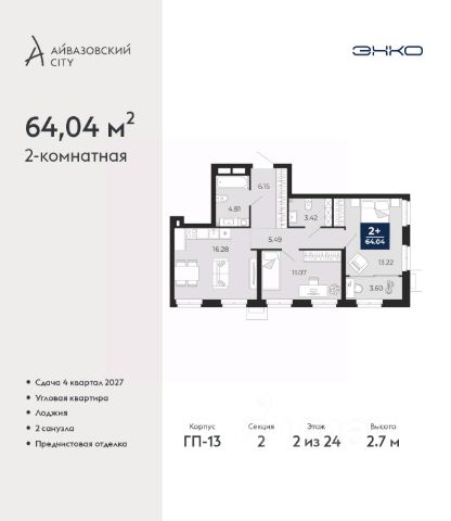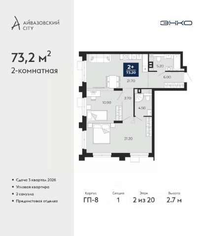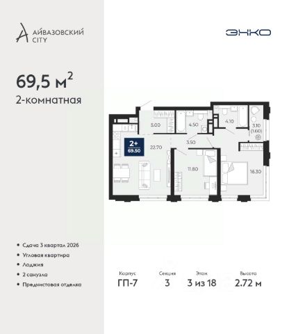 2-комн. квартира в ЖК "Айвазовский City" на 2 этаже. Квартира без отделки, полностью готова к ремонту. Общая площадь: 90.06 кв.м., жилая: 42.88 кв.м., площадь просторной кухни-столовой: 23.18 кв.м. Квартира угловая, идеально подойдет любителям тишины и панорамных видов. В квартире одна лоджия, два совмещенных санузла. Высота потолков 2.72 м.