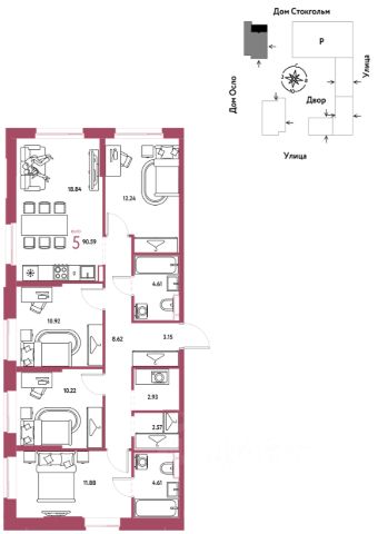 две просторные комнаты площадью 24,5 кв.м. и 17,4 кв.м., одна из которых является мастер-спальней с собственной гардеробной и полноценным санузлом.