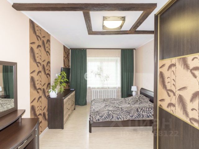 В гостиной расположен кожаный раскладной диван, кожаное кресло, тюль и плотные шторы. В спальной комнате двуспальная кровать с матрацем и наматрасником, прикроватная тумбочка, удобный и вместительный встроенный трехдверный шкаф, на окнах рулонные шторы (блекаут, т.к. солнечная сторона), тюль и плотные шторы, на полу постелен ковролин, установлен кондиционер.