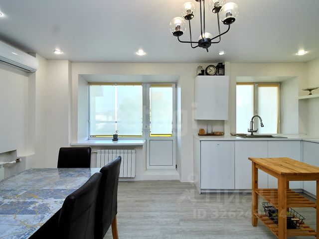 Кухонный гарнитур из массива, межкомнатные двери массив. На полу в комнатах, в кухне и в коридоре ламинат, санузлы обложены плиткой, балконы обшиты вагонкой и застеклены.