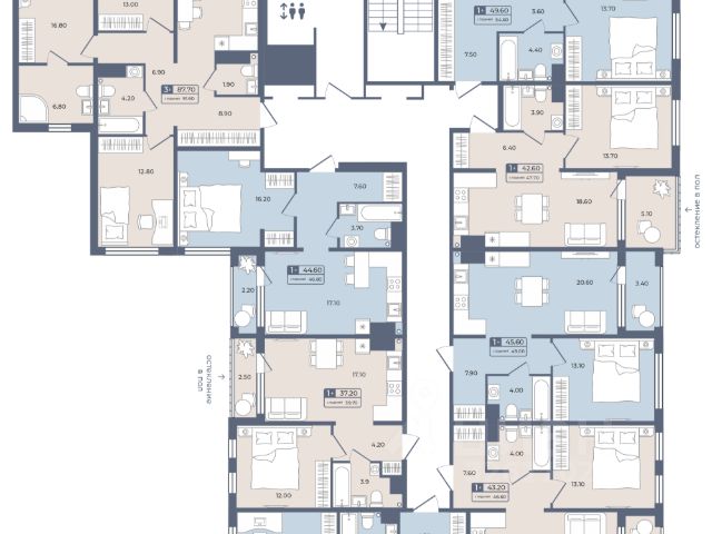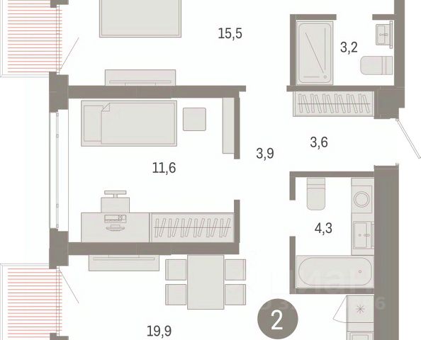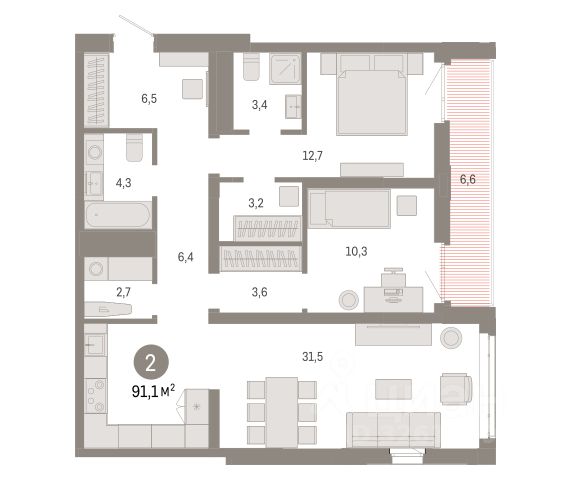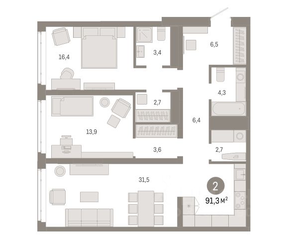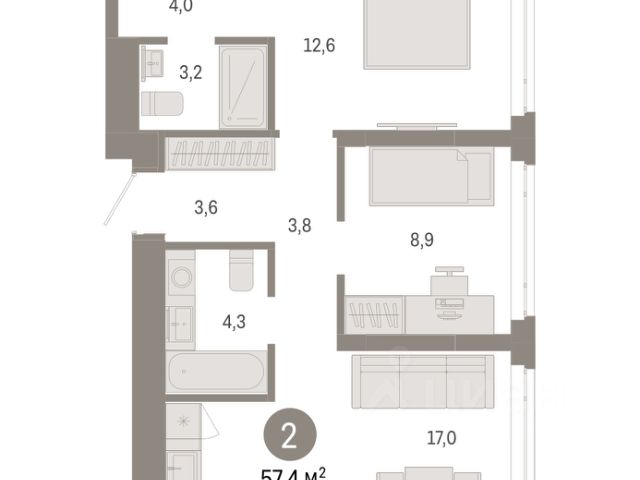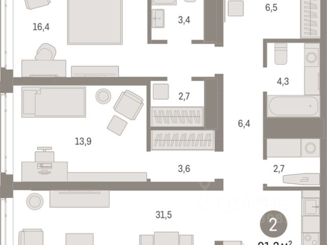 2-комн. квартира с предчистовой отделкой в ЖК "Республики 205" на 13 этаже. Общая площадь: 80.12 кв.м. Высота потолков 2.7 м.