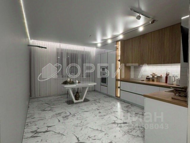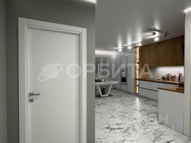На потолках качественные натяжные потолки премиального материала, с теневым профилем, подсветкой по периметру и световыми линиями, имеются накладные треки в кухне и в детской.
