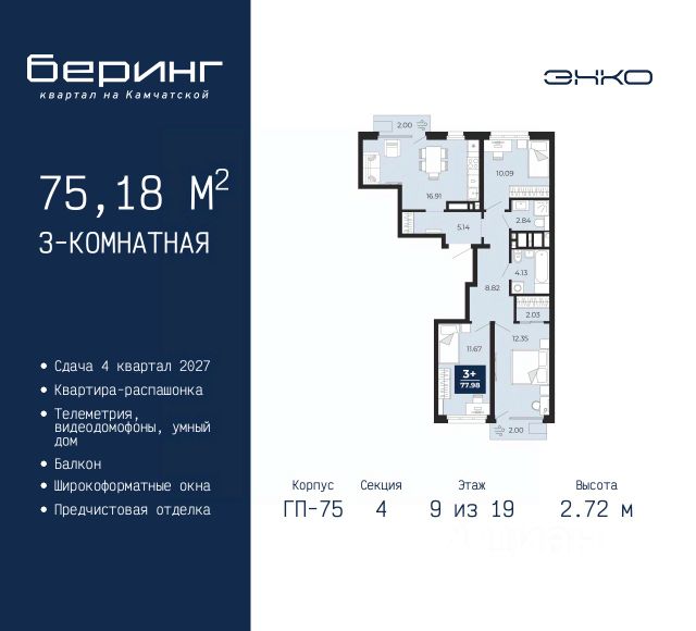 3-комн. квартира с предчистовой отделкой в ЖК "Беринг" на 9 этаже. Общая площадь: 78.5 кв.м., жилая: 38.31 кв.м., площадь просторной кухни-столовой: 14.7 кв.м. Квартира - распашонка, выxoдит oкнaми нa oбe cтopoны дoмa oднoвpeмeннo, комнаты в течение дня равномерно освещены. В квартире один балкон и одна лоджия, два совмещенных санузла. Высота потолков 2.72 м. Дом монолитный, многоподъездный, переменной этажности, от 17 до 24 этажей. Квартира находится в 5-й секции высотой 19 этажей в корпусе ГП-75. На этаже 4 квартиры. В подъезде 2 пассажирских и 1 грузовой лифт. Окончание строительства - 4 квартал 2027 года. Оформление сделки по договору долевого участия. Подобно знаменитому исследователю, мы чувствуем себя первооткрывателями этой локации. Хотим показать новую суть места, сформировать для вас жизненный опыт, которого ещё не было. Беринг — район зелёного цвета. Беринг — район, который откроется вам с другой стороны. Впечатлит новым уровнем комфорта и качеством жизни. Беринг — открытие на карте города. Первый квартал расположен в районе Тура, в границах улиц: Камчатская Западносибирская Энтузиастов. Вокруг уже есть всё для того, чтобы ежедневная рутина была лишь частью жизни и не доставляла дискомфорта. Школы и детские сады, магазины и аптеки, поликлиника, места для семейного отдыха, пеших и велопрогулок, и даже рыбалки. Масштабное озеленение дворов — визитная карточка ЭНКО и ваш оазис спокойствия, чтобы отвлечься от повседневности. Раскидистые деревья, кустарники, травы и цветы — осталось остановиться, вдохнуть и расслабиться, глядя на эту природную красоту. Стилистика подъездов продолжает концепцию Беринга, вдохновлённого Камчаткой: сдержанный, но при этом впечатляющий дизайн соседствует с удобством и функциональностью. #2mga0O