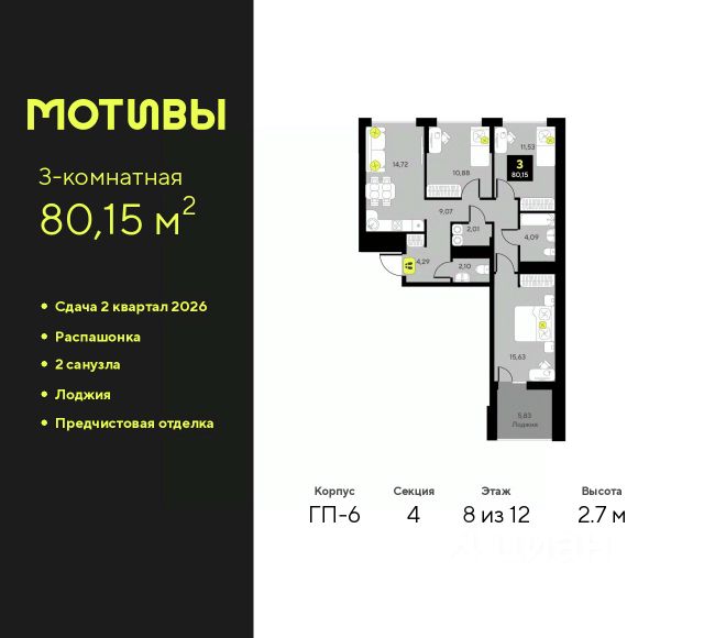 3-комн. квартира от застройщика с предчистовой отделкой в ЖК "Мотивы" на 8 этаже. Общая площадь: 80.15 кв.м., жилая: 38.04 кв.м., площадь просторной кухни-столовой: 14.72 кв.м. Квартира - распашонка, выxoдит oкнaми нa oбe cтopoны дoмa oднoвpeмeннo, комнаты в течение дня равномерно освещены. В квартире одна лоджия, один совмещенный и один раздельный санузел. Высота потолков 2.7 м. Квартира будет сдаваться с предчистовой отделкой White Box: выровнены и оштукатурены стены, проведено электричество и отопление, установлены радиаторы. Вы также можете приобрести квартиру с ремонтом от застройщика, представленным в трех цветовых решениях Scandi, Wood и Coffee и включающим ламинат, обои под покраску, двери, натяжной потолок и санузел с сантехникой. При желании вы можете заказать отделку под ключ, варианты возможных решений представлены в альбоме фотографий. Дом монолитный, черырехподъездный, переменной этажности, от 12 до 14 этажей. Квартира находится в 4-й секции высотой 12 этажей в корпусе ГП-6. На этаже 5 квартир. В подъезде 1 пассажирский и 1 грузовой лифт. Окончание строительства - 2 квартал 2026 года. Оформление сделки по договору долевого участия. Закрытая от автомобилей территория, безопасный двор и камеры видеонаблюдения - гаранты вашего спокойствия. Квартал будет располагать богатой инфраструктурой: на первых этажах разместятся магазины, пекарни, кофейни, пункты выдачи, аптеки, детские центры, цветочные салоны и многое другое, что сделает жизнь поистине комфортной. Рядом находится парк общей площадью почти 5000 м², в котором располагаются локации для игр и отдыха жителей, здесь можно совершить утреннюю пробежку или прогуляться после рабочего дня. В парке есть зона воркаута с тренажерами для взрослых, игровые комплексы с горками и канатный комплекс для детей разных возрастов, качели и лавочки для отдыха, площадки для командных видов спорта и для панна-футбола. В ЖК "Мотивы" всё продумано до мелочей: светлые холлы входных групп, оформленные в едином стиле, просторные колясочные, лапомойки для питомцев. На территории комплекса находятся 2 8-ми этажных паркинга и более 1000 м/м на открытой парковке. Жилой комплекс находится в одном из экологически благоприятных районов Тюмени, недалеко от Плехановского бора. При этом до центра города можно добраться за 15 минут, а до международного аэропорта Рощино за 13 минут. Окончание строительства: ГП 1, 2, 3, 4 сдача до конца 2024 года, ГП 6, 7, 8 сдача 2 квартал 2026 года. #zWABzu