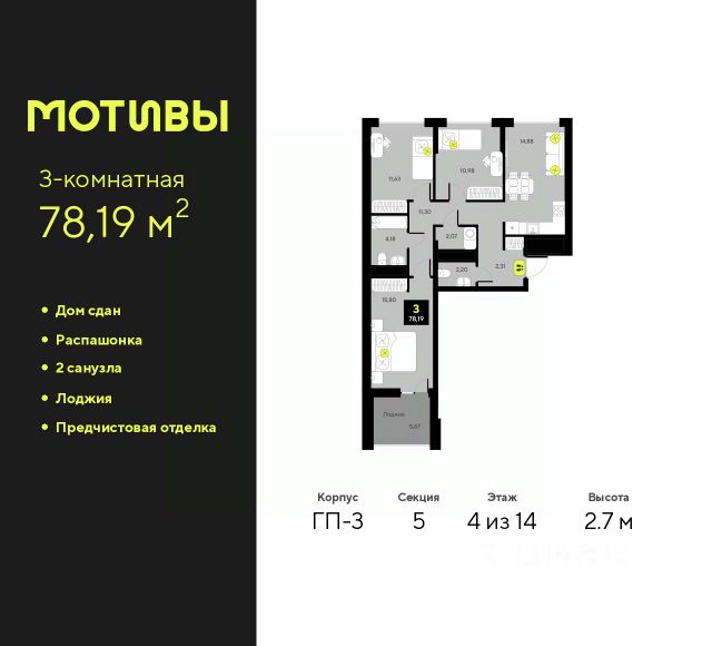 3-комн. квартира от застройщика с предчистовой отделкой в ЖК "Мотивы" на 5 этаже. Общая площадь: 80.02 кв.м., жилая: 37.95 кв.м., площадь просторной кухни-столовой: 14.72 кв.м. Квартира без проходных комнат, окна выходят нa три cтopoны дома. В квартире одна лоджия, один совмещенный и один раздельный санузел. Высота потолков 2.7 м. Квартира будет сдаваться с предчистовой отделкой White Box: выровнены и оштукатурены стены, проведено электричество и отопление, установлены радиаторы. Вы также можете приобрести квартиру с ремонтом от застройщика, представленным в трех цветовых решениях Scandi, Wood и Coffee и включающим ламинат, обои под покраску, двери, натяжной потолок и санузел с сантехникой. При желании вы можете заказать отделку под ключ, варианты возможных решений представлены в альбоме фотографий. Дом монолитный, черырехподъездный, переменной этажности, от 12 до 14 этажей. Квартира находится в 5-й секции высотой 14 этажей в корпусе ГП-6. На этаже 5 квартир. В подъезде 1 пассажирский и 1 грузовой лифт. Окончание строительства - 2 квартал 2026 года. Оформление сделки по договору долевого участия. Закрытая от автомобилей территория, безопасный двор и камеры видеонаблюдения - гаранты вашего спокойствия. Квартал будет располагать богатой инфраструктурой: на первых этажах разместятся магазины, пекарни, кофейни, пункты выдачи, аптеки, детские центры, цветочные салоны и многое другое, что сделает жизнь поистине комфортной. Рядом находится парк общей площадью почти 5000 м², в котором располагаются локации для игр и отдыха жителей, здесь можно совершить утреннюю пробежку или прогуляться после рабочего дня. В парке есть зона воркаута с тренажерами для взрослых, игровые комплексы с горками и канатный комплекс для детей разных возрастов, качели и лавочки для отдыха, площадки для командных видов спорта и для панна-футбола. В ЖК "Мотивы" всё продумано до мелочей: светлые холлы входных групп, оформленные в едином стиле, просторные колясочные, лапомойки для питомцев. На территории комплекса находятся 2 8-ми этажных паркинга и более 1000 м/м на открытой парковке. Жилой комплекс находится в одном из экологически благоприятных районов Тюмени, недалеко от Плехановского бора. При этом до центра города можно добраться за 15 минут, а до международного аэропорта Рощино за 13 минут. Окончание строительства: ГП 1, 2, 3, 4 сдача до конца 2024 года, ГП 6, 7, 8 сдача 2 квартал 2026 года. #Zm9biE