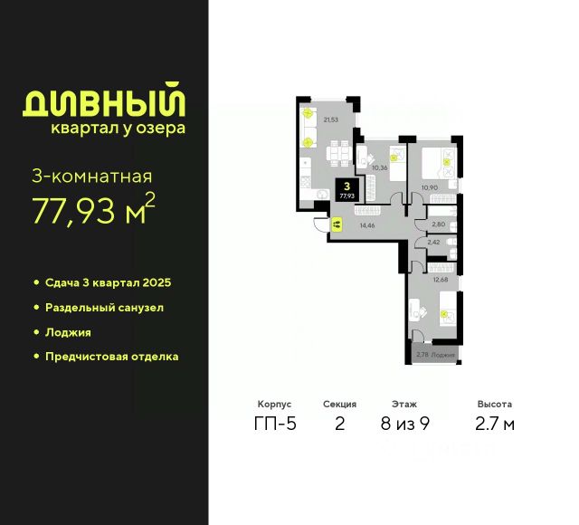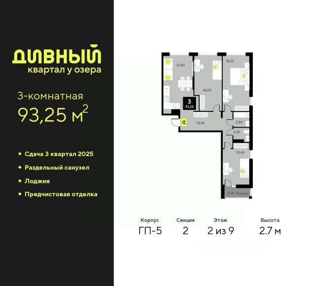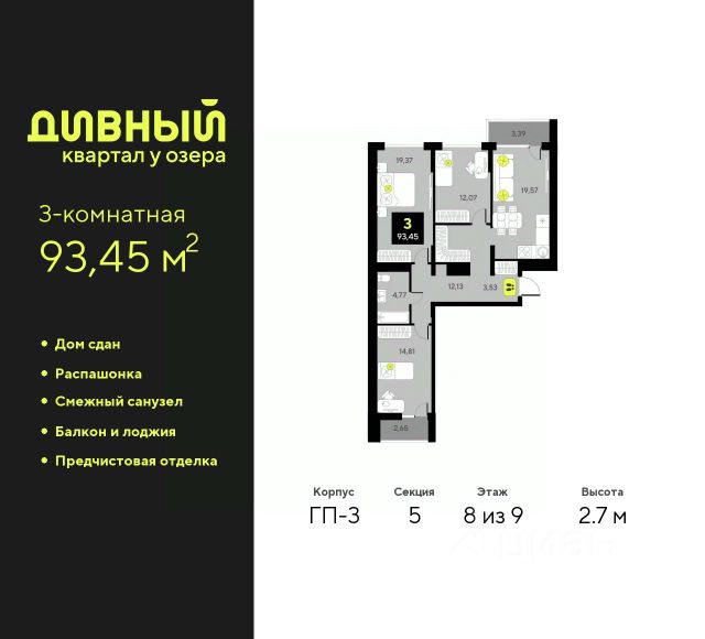 Просторная 3-комн. квартира с предчистовой отделкой в ЖК "Дивный квартал у озера" на 2 этаже. Общая площадь: 93.25 кв.м., жилая: 48.99 кв.м., площадь просторной кухни-столовой: 21.8 кв.м. Квартира без проходных комнат, окна выходят нa три cтopoны дома. В квартире одна лоджия, один раздельный санузел. Высота потолков 2.7 м. Квартира будет сдаваться с предчистовой отделкой White Box: выровнены и оштукатурены стены, проведено электричество и отопление, установлены радиаторы. Вы также можете приобрести квартиру с ремонтом от застройщика, представленным в трех цветовых решениях Scandi, Wood и Coffee и включающим: ламинат, обои под покраску, двери, натяжной потолок, санузел с сантехникой. При желании вы можете заказать отделку под ключ, варианты возможных решений представлены в альбоме фотографий. Дом монолитный, черырехподъездный, переменной этажности, от 7 до 9 этажей. Квартира находится во 2-й секции высотой 9 этажей в корпусе ГП-5. На этаже 5 квартир. В подъезде 1 пассажирский и 1 грузовой лифт. Окончание строительства - 4 квартал 2025 года. Оформление сделки по договору долевого участия. "Дивный квартал у озера" современный жилой квартал, удобно расположенный в 10-ти минутах от центра Тюмени, в уютном районе рядом с зеленым массивом и озером Алебашево. Комплекс находится между улицами Мельникайте и Алебашевская, что обеспечивает его хорошую транспортную доступность до центра на автомобиле всего 10 минут. Рядом с комплексом расположен Лесопарк имени Гагарина, экзотический Парк дружбы между Россией и Республикой Корея. "Дивный квартал у озера" объединяет архитектуру современной городской застройки и природную эстетику. Уютные дворы жилого комплекса будут не только безопасными, но и тихими. Закрытая территория надёжно защищена от шума и посторонних глаз. Здесь будут места для отдыха, детские площадки, зоны для выгула собак. В холлах первого этажа расположены мягкая зона ожидания, общественные санузлы и просторная колясочная. Квартал будет располагать богатой инфраструктурой: на первых этажах домов разместятся магазины, пекарни, кофейни, пункты выдачи, аптеки, детские центры, цветочные салоны и многое другое, что сделает жизнь поистине комфортной. В комплексе есть теплый подземный паркинг и кладовые. #z4ac4U