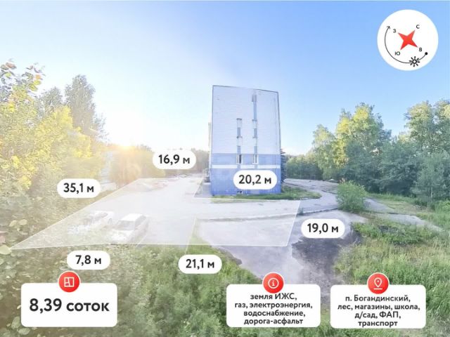 В радиусе 2-3км есть: Детский Сад, Дом Культуры, ДЮСШ 2 спортивных комплекса + центр боевых искусств, МФЦ, Отделение Сбербанка. Продается участок под дачу в поселке городского типа Богандинский Тюменского района.